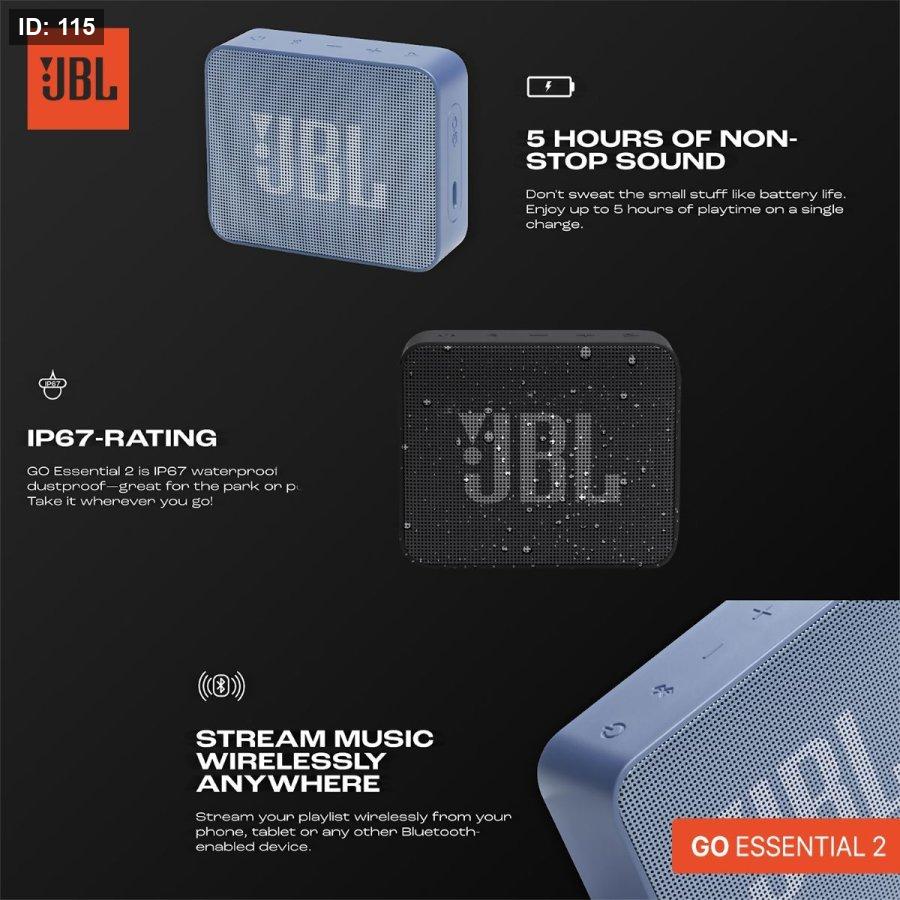 مكبر صوت JBL GO ESSENTIAL 2 صغير محمول بتقنية البلوتوث، يتميز بصوت JBL Pro قوي، وصوت جهير قوي، وتصميم جريء، ومقاوم للماء.